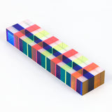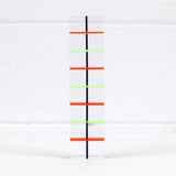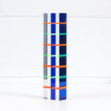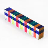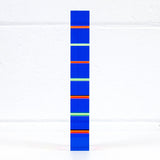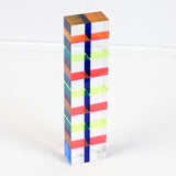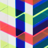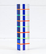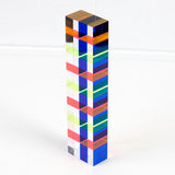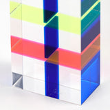 Typically, Mihich works with solid planes or blocks or colored acrylic. "Neon Tower" is a curious and remarkable anomaly as clear acrylic is the dominant material, with slices of electric blue, neon yellow and melon intersecting the form. Depending on how its position, as one examines the sculpture from different angles, the colors overlap the transparent sections, creating new perceptive forms.