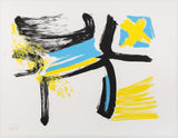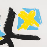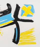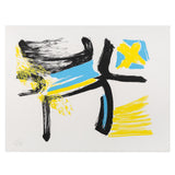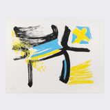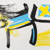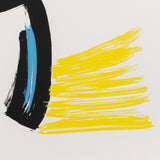 "Afterthought" is exemplary of Dzubas' use and love of powerful colours. Combining canary yellow, robin's egg blue, and strong black lines, the artist offers a dynamic and energetic composition. Dzubas' hand is palpable here, through layered, brushy texture of each colour application.