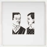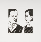 Each woodcut from the portfolio conveys a sense of tension and mystery--a feeling that is not uncommon when viewing Katz's work. In "Julian and Jessica," two figures stare intently at each other, rendered in thick black lines. The energy in the negative space radiates with emotion, and it's almost impossible to avoid looking back and forth between the two. Charged and direct, this print is an excellent example of Katz's ability to distill a singular moment into a striking image.