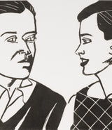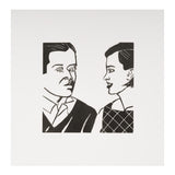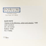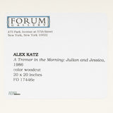 With a deep and direct connection to the poets of the New York School, Katz has collaboratively engaged with its' members throughout his career. This work is from the A Tremor in the Morning portfolio, which was a collaborative project that Katz completed with his son, the esteemed poet Vincent Katz. Shockingly direct, the prints are monochromatic woodcuts, stark and informative. Each image features a couple from Katz' artistic cannon. Providing romantic context to the poetic components, the woodcuts are simultaneously decisive and questioning--as they ponder the prose: