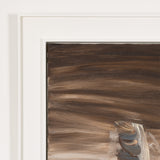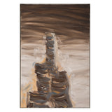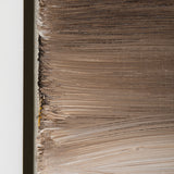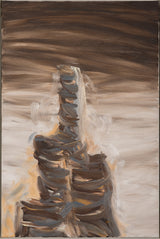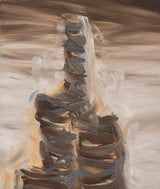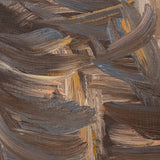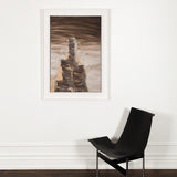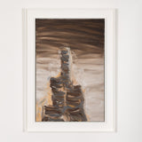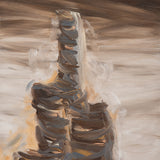 This painting is both intriguing and haunting, a true paradigm from her oeuvre. Rendered in shades of taupe, chocolate, chestnut and elephant grey with accents of tangerine, the painting depicts a soaring, evocative, hallucinatory construction. Evocative of a ribcage, the tower soars through a shroud of clouds. In "Tower/Bones," Diamond offers her viewers a dizzying architectural limb emerging from mist, clouds, smog...or memory.
