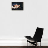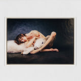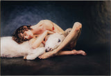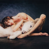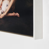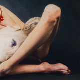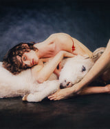 "Richard (Donkey)" shows a raw and tender moment, in which human and animal are captured exactly as they are. Richard's head rests gently on the donkey's side as he stares into the camera. His limbs melt into the animal, as it burrows its head into him. With a mysterious background and a dribble of blood, this work evokes themes of mythology.