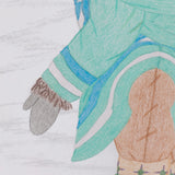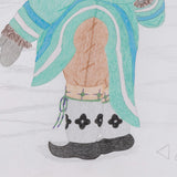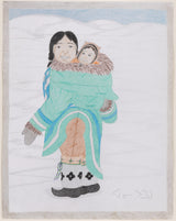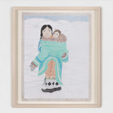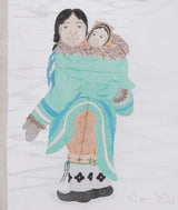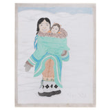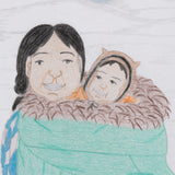 This drawing of a mother and child was created with her signature coloured-pencil technique: flat yet dimensional, delicate yet deliberate. Standing in the foreground of a vast expanse of ice and snow, a mother holds her baby nestled inside her parka. Both figures stand facing the viewer, smiling. Pootoogook has drawn a frame around the image, creating a unique and complete portrait.Â