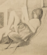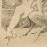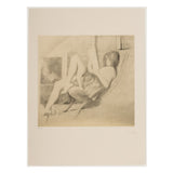 "Jeune Fille Assise," or "Young Girl, Seated," intimately portrays a figure reading on a lounger. Holding a page up to her face, the model sits comfortably with one leg propped up on the seat and her head lying against the back of the chair. Balthus' markmaking is soft, diffusing the image and creating a blurred, almost voyeuristic effect. This gently-rendered quiet moment captures the figure's innocence during this private and intimate moment of solitude.
