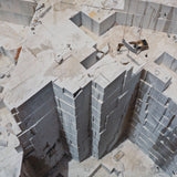 This work, photographed in Portugal, is a paradigm of Burtynsky's acclaimed Quarries series. Layers of un-mined marble and the ravine walls bear geometric patterns from the markings of individual blocks. The result is an illusory effect as if the mountain itself were created by human hand (not vice-versa).