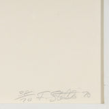 Stella was an active printmaker and experimented with techniques to achieve a specific aesthetic. These works were first screenprinted before the lithographic inks and varnishes were applied - and as a result are far more complex than typical lithographs. Stella intentionally place the compositions of his early prints in the left corner as a strategy to emphasize his authorship of his prints.