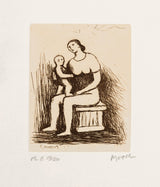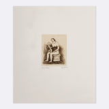 This etching is one of eight from Moore's Mother and Child portfolio. A mother sits on a pedestal, holding a standing child on her lap. She gazes at her offspring, frozen in this precious moment. The figures are portrayed in Moore's sculptural style, their length and fullness coming through their two-dimensional portrayal.