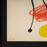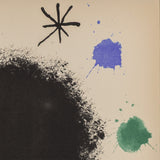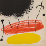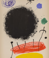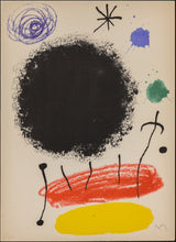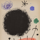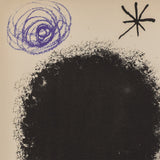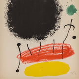 This plate is especially energetic. Reminiscent of a black hole, the shapes and colors are frozen in a frenetic movement. At the bottom of the page, yellow and red swirls of color anchor black, vertical lines that lead to the middle of the page. A large, blotted black sphere with soft edges floats just above the lines, surrounded by a smaller variety of circular, scribbled, and star shapes. Classically Miro, this composition is fantastically playful, full of color, and masterfully executed.
