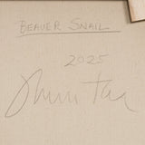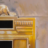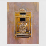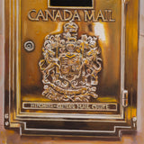 "Beaver Snail" depicts a gold mail chute against a pink-beige stone wall. Adorned with the Canada Mail logo and coat of arms, a lock, and a beaver sitting atop of the frame. Although we are viewing a fairly flat image, Tod manages to imbue a sense of depth in her treatment of light. The reflections in the brass from windows and the golden halo that it casts against the stone wall allow viewers to enter the space psychologically, feeling a sense of what Tod felt as she stood in the space and photographed what she saw.
