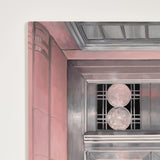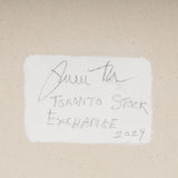 Tod's painting depicts the doors of the Exchange, shining and reflecting sunlight. The artist is renowned for her treatment of light, here it lends a warmth to the pinkish stone facade and luminosity to the steel features. The details included are comprehensive, down to the cast shadows of the specific Toronto streetlights that stand across the street. The painting is immersive, the space inviting as if one could step inside and feel the warm sunlight on their skin.
