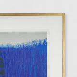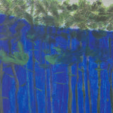 In "Dark Pines," four bands of color make define the composition. At the base of the image, shades of verdant green, punctuated with magenta, blends into a primary yellow color field. The yellow alternates as being understood as both expressive color of sunlight. Tall, slender trees shoot up from the ground, their green and brown foliage mingling or almost submerged against a blue background. Kahn has scraped lines into this section, representing ghost-like presence of a densely-packed forrest.
