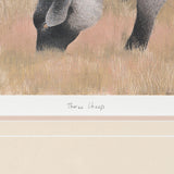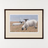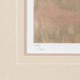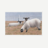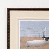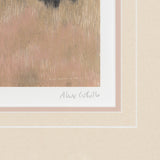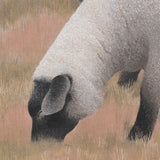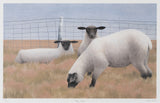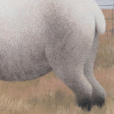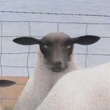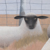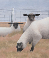 "Three Sheep" features a trio of sheep, one grazing while the other two perch up above the tall grass to fixate on the viewer. Their strong gaze is ambiguous yet full of apprehension while their mask-like faces heighten the mystery of this pastoral scene.