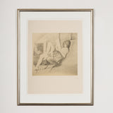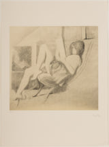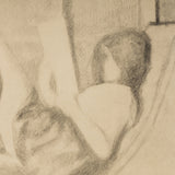 "Jeune Fille Assise," or "Young Girl, Seated," intimately portrays a figure reading on a lounger. Holding a page up to her face, the model sits comfortably with one leg propped up on the seat and her head lying against the back of the chair. Balthus' markmaking is soft, diffusing the image and creating a blurred, almost voyeuristic effect. This gently-rendered quiet moment captures the figure's innocence during this private and intimate moment of solitude.