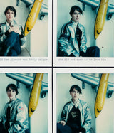Here a traditional typewriter embosses and prints narrative text enlivening the portraits it surrounds. Nancy is photographed in a silver bomber jacket and jeans, seated casually next to an inflatable airplane. The narrative, presented in the third person, recounts the struggle between the woman's self-perception and the male gaze that seeks to shape (or confine) her. The push and pull between the two voices call into question the tension between identity and external pressures in a patriarchal framework.