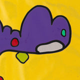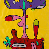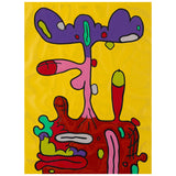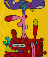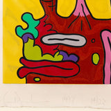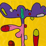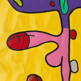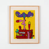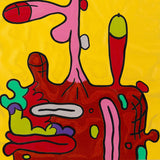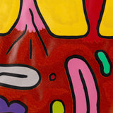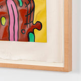 "Nine Color Reduction" is an excellent example of the artist's preferred forms and aesthetic. Set against a vibrant saffron background, amorphous forms executed in violet, cotton candy, cherry red, and chartreuse retract, expand, and protrude throughout the center of the work.