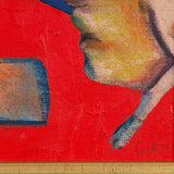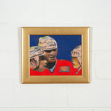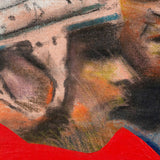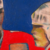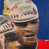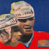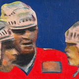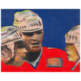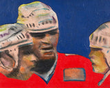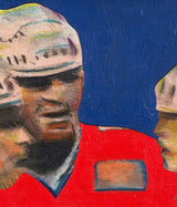 One year after completing the TTC mural, Pachter again paid homage to hockey with this painting, "Hockey Knights". In this painting he depicts three players in vivid red uniforms huddling mid-game. An almost expressionistic quality presents itself in the flashes of turquoise, lime green, and purple in the player's white helmets; and beneath their stylized facial features, showcasing their physical exertion.
