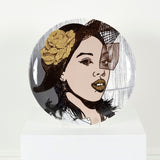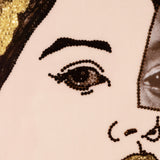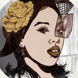 Referencing the Mona Lisa, the posed woman faces forward, her still features anchored by the strength in her gaze as she fixates on the viewer.
