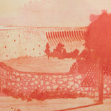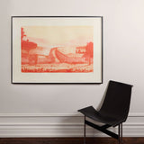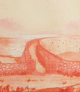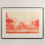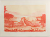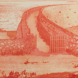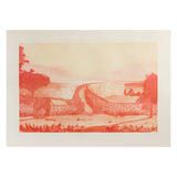 Rendered in a muted reds, "Muldenberg" depicts a postcard view of a German dam complete with a winding stone fortress that creates a barrier between land and water.
