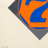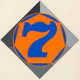 Completed in vibrant color blocks of cobalt and orange, "Heptagon" confidently displays the number seven at the center of the work. Numbers were a recurring point of interest for the artist who would reimagine single digits through various series and mediums. Indiana was also tremendously inspired by road signs and highway advertising. This work, whether overtly or unconsciously, recalls the logos of the "Gulf" and "76" gas stations.