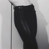 In this striking portrait, Lyon stands against a blank backdrop, lit from above. She holds a chrome handle with either hand, leaning into her pose. She wears leather pants, loose hair, a bare chest, and shades. Staring straight at the camera, she is an image of power, sexuality and grace.