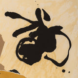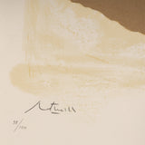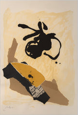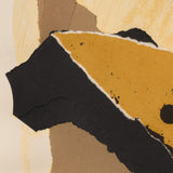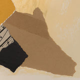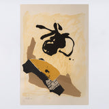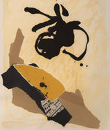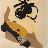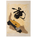 In this work we find exemplary Motherwell fashion; a bold, abstract black shape is set against a field of color. Neutral colors, such as taupe, cream and ochre are frequently used by Motherwell to accelerate the power of his black elements. Collaged into the work is section of sheet music amongst abstracted blocks of muted neutral colors. Where the Cubists incorporated collage into the painted canvas, Motherwell similarly fused collage with printmaking while retaining the gestural spirit of Abstract Expressionism.