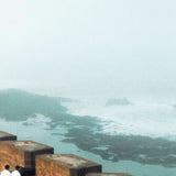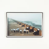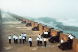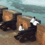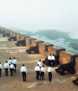 The first screen features a group of men, uniformly dressed as they methodically navigate the confines of a beachfront fortress, as featured in this still image. Meanwhile, the opposing screen showcases a group of women dressed in chadors with unrestricted movement throughout an open shorefront. Towards the film's conclusion, a few women embark on a boat, their destination unknown.