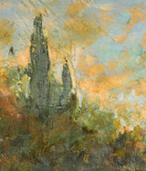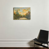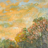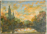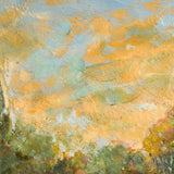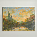 This exemplary work is marked by intricate layers of color and a richly textured surface creating an atmospheric Italianate landscape. A ring of trees commands the composition, their varied hues suggesting the transient shift of the seasons. They form a perimeter around a central pond, which mirrors the luminous shades of mauve and lemon from the commanding sunset above. The result is a dreamy, light-bathed composition with an ethereal glow.