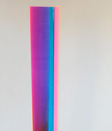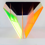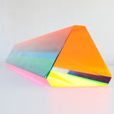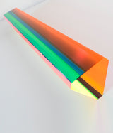 His sculptures, with their different geometric planes suspended in acrylic are dynamic and endlessly fascinating. Any position leads to dramatic color shadows, and if the viewer circles around the piece, different regions of color presented themselves, overlapped with another or disappeared.
