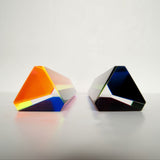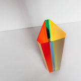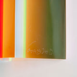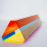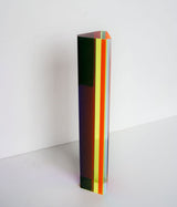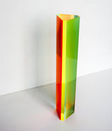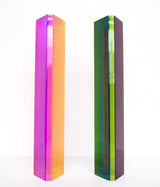 "Hawaii" is composed of yellow, tangerine and bubblegum pink, while "Primary" is composed of red, green and blue. Both feature a thin upright planks composed of geometric planes of different colors suspended in acrylic.