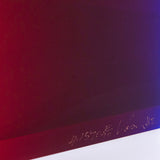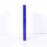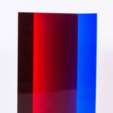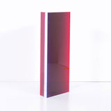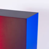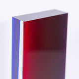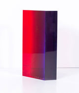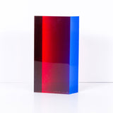 “Red Prism” features a strong palette of electric cobalt blue contrasted with vibrant tones of red. As with the best of Mihich's work, the geometric form and color distort as the viewer moves around the sculpture. The sharp layers of complementary color slant and expand when viewed from the side, revealing a surprising illumination of purple.