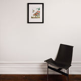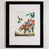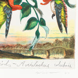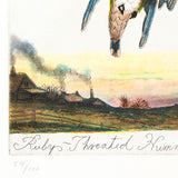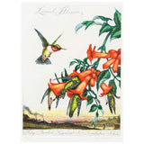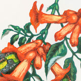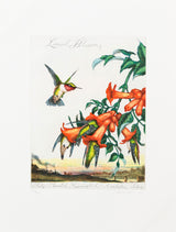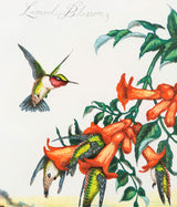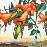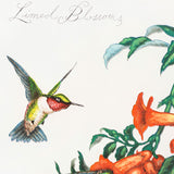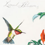 "Limed Blossoms" features a bouquet of hummingbirds feeding on nectar from trumpet-shaped flowers. Rendered in a tropical palette, the serene ecosystem occupies the foreground of the work, positioning the viewer as an observer of this intimate natural habitat.