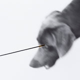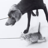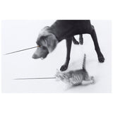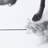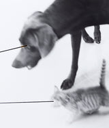Together, the dog and cat convey a sense of mischievous urgency, presenting a much more raw dynamic than Wegman's traditionally portrait-like depictions of Weimaraners. Highly atypical, the artist has added a line or beam, either on the negative or once printed, emanating from each animal's eye.