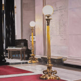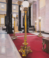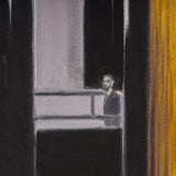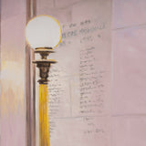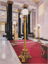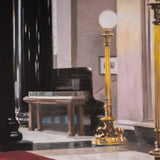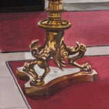 Tod captures the ornate features of the historic building in "La Banque" in her signature brand of realism. There is both a precision and softness in her approach. One of Tod's painting strategies is applying thin layers of paint to emphasize and illuminate the brighter hues. While her treatment of light is typically attentive, it's emphasized in this canvas given the numerous light sources and almost entirely reflective surfaces. This painting is a paradigm of Todâs ability to amplify interiors into charged, almost theatrical settings or portals. For Tod, portraying deep space is as much an entity as a subject sitting for a portrait.