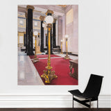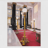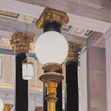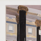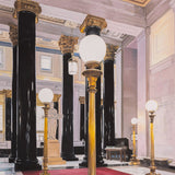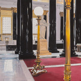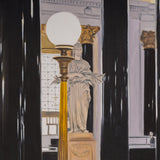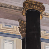 This painting depicts the grand foyer of the Montreal headquarters for the Bank of Montreal, or BMO. It is one of the key landmarked buildings of Place d'Armes. Located at 119 Rue Saint-Jacques, this building has been an iconic landmark since 1819. Constructed in a neoclassical style, the structure was inspired by the Roman Pantheon. The lavish lobby features 32 corinthian columns made with green syenite, gold capitals, and a decorated coffered ceiling. Tod visited the building to attend the unveiling of a portrait she was commissioned to paint of the departing CEO, William Downe.