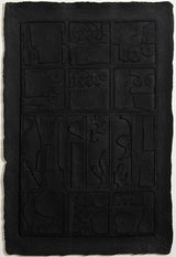 “Moon Garden” is a superb example of Nevelsonʼs impressive molded reliefs in black paper pulp. A paradigm of her visual language, it demonstrates her ability to translate her sculptural work into printmaking. This piece utilizes the technique of cast paper, where paper fibre or pulp is formed into a mold and creates a relief.