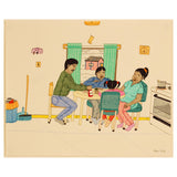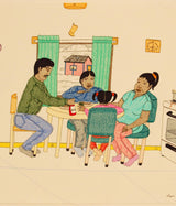 "Eating Dinner" exemplifies Pootoogook's artistic vision and output. In this drawing, a family of four is seated in the kitchen sharing a meal. In the warm domestic setting, juxtaposed against the cold winter day outside, a comforting hum of activity fills the air. Housewares are left out mid-task as the family breaks for a home-cooked meal, creating a serene pause amidst the bustling household chores. Interior domestic settings, specifically showcasing food preparation and female domestic life, are among Pootoogook's best-known imagery.