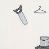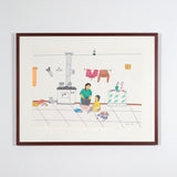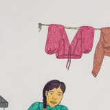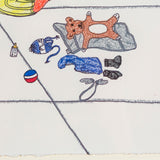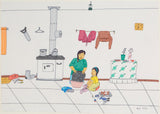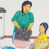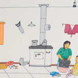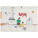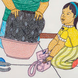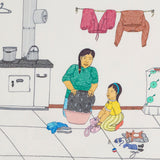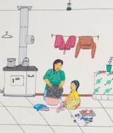 "My Mother and I" exemplifies Pootoogook's artistic vision and output. In this complex drawing, a woman and her young child sit together on a kitchen floor. The mother washes laundry while the daughter unpacks a teddy bear, a tri-color ball, mittens, and a soother from a small pink purse.