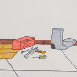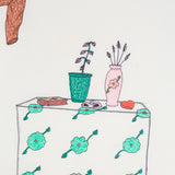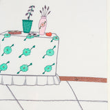 The rest of the room is casual and colorful, tools lay strewn about while the table is decorated with plants and a floral tablecloth. Pootoogook presents this mundane activity nonchalantly carried out by the women of this household. Interior domestic settings, specifically showcasing food preparation and female domestic life, are among Pootoogook's best-known imagery.