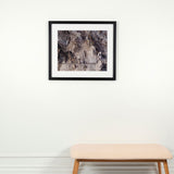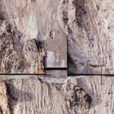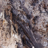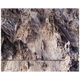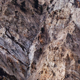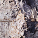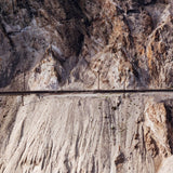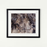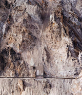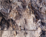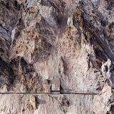 "Railcuts #4" captures the textured facade of blasted rock in a confrontational close-cropped composition. A bold linear incision slices through the lower third of the image, evoking a sense of direct, even violent, contact with the landscape.