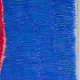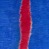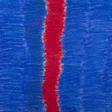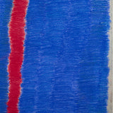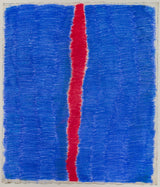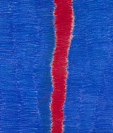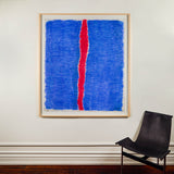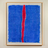 The composition is divided into vertical cobalt planes that pulse with frenetic, back-and-forth strokes, evoking a sense of movement and energy. A crimson crack cuts through the center of the work, introducing a striking contrast and palpable tension that ripples through the sheet.