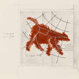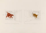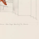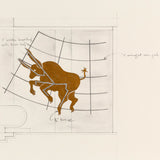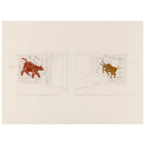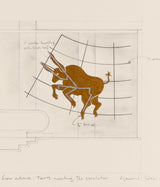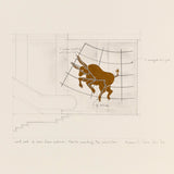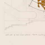 "East Wall of the Main Floor Stairwell" is one of the final preparatory drawings for the installation. The work features General Idea's hand-written inscriptions which detail the anticipated location for the mural's components. The mural merges two very distinct concepts; the notion of a "bull" and "bear" market, relating to the stock exchange, and the constellations of Ursa Major (Great Bear) and Taurus (Bull)