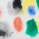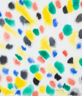 This radiant and elaborate watercolor was realized in a tight palette of black, canary yellow, cinnabar red, and emerald green. More often than not, Iskowitz watercolors are composed of larger forms in grouped island-like arrangements. Here the artist speckles the surface with smaller dabs of color that seem to be rising to the surface. This more concentrated distribution of color is more inline with his paintings from the late 1960's. As a result, "Confetti" is an exceptional example of an Iskowitz watercolor.