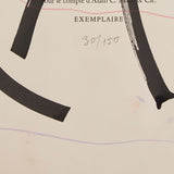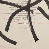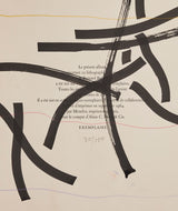 "Exemplaire" presents a diversion for the artist, who repurposes the colophon page from a set of Bernard Buffet lithographs into a unique work. There are serval instances where artists "hijack" existing works to alter or reinterpret them. This type of unofficial collaboration recalls Robert Rauschenberg’s "Erased de Kooning Drawing," where the artist famously erased Willem de Kooning’s drawing to create a new work.