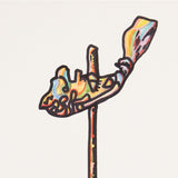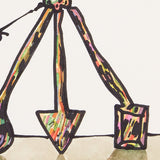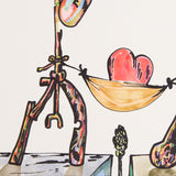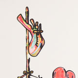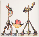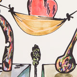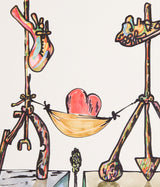 "Heart Hammock" is an intimate and surreal illustration created in the last chapter of the artist's career, when this playful/groovy aesthetic debuts. This fantastical drawing is realized in a candied palette of cherry red, lime, bubblegum, periwinkle, and ochre, all with thick black contours. This specific illustrative style is evident in several works from this period, and published in a whimsical children's book in 1987 entitled, "Murphy the Wonder Dog"
