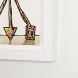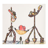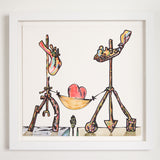 This charming drawing features a heart suspended in mid-air, cradled by a hammock that is supported by two industrial-inspired figures. The curious juxtaposition of the softened shape of the heart with the rigid, mechanical forms creates a striking contrast that invites the viewer to contemplate themes of love and support in every era.