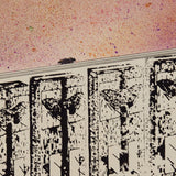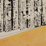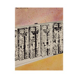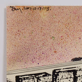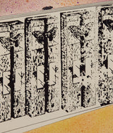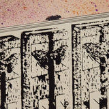 In this piece, the artist uses a stencil to repeat a striking arrangement of vertical forms embedded with abstracted butterflies. Through repetition, the motifs take on a graphic, almost illusory quality, heightened by softly speckled washes of grapefruit, citron, and lavender.