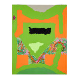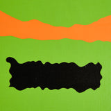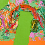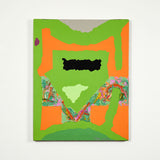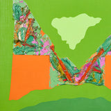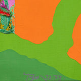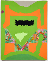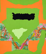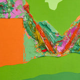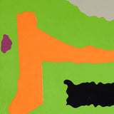 In this work, a sprawling bright lime backdrop is host to a series of flat, irregular shapes rendered in vibrant shades of moss green, tangerine, black, and slate. The two-dimensional plane is juxtaposed by a thick, prismatic impasto that runs through the center of the canvas, accentuating the organic contours of the composition.