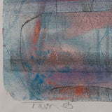 This complex pastel-hued example of a "Single Autographic Print" is Harold Town at his finest. The muted somewhat transparent colors merge and overlap in a horizontal gradient creating a hazy, almost impressionistic abstract surface. Interestingly, the title of this work makes reference to Katsushika Hokusai (the legendary Japanese printmaker), a connection that invites the viewer to explore the atmospheric qualities in this work.