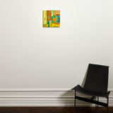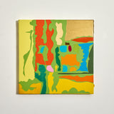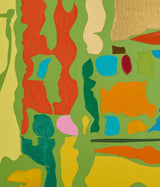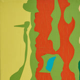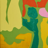 This lively example comes to us on a remarkably intimate scale. Set against a sprawling bright lime backdrop, a hallmark of this series, lie flat, irregular shapes rendered in vibrant shades of tangerine, blood orange, gold, and canary yellow.