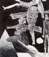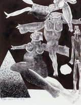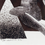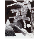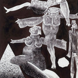 In this iteration, stylized figures take flight, hovering above the pyramid with their arms extended outward. Town's meticulous use of cross-hatching and pointillism creates a richly textured surface while amplifying the sense of movement and vitality within the composition. "Vale Variations" remains a testament to Town's expansive imagination and unwavering commitment to his artistic evolution.
